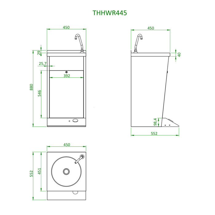 Handwaschbecken aus Chrom-Nickel-Stahl Aisi 201, mit abschließbarem Unterschrank und Fußpedal. Mit Auslaufhahn, ohne Mischventil (nur Kaltwasser)