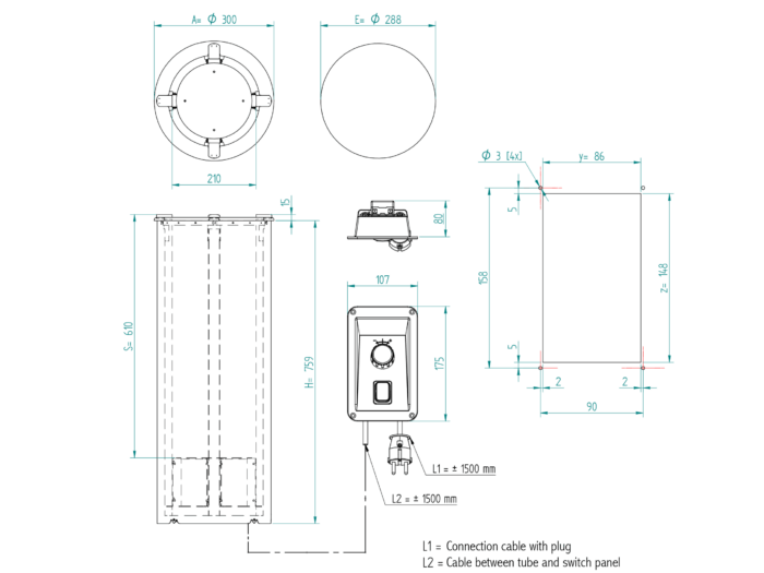 Einbau-Tellerwärmer 230 V – 400 W, für runde Teller 170-208 mm, mit separater Schaltblende mit einstellbarem Thermostat, mit 4 festen Geschirrführungen