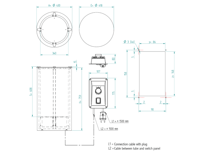 Einbau-Tellerwärmer 230 V – 400 W, für runde Teller 300-338 mm, mit separater Schaltblende mit einstellbarem Thermostat, mit 4 festen Geschirrführungen