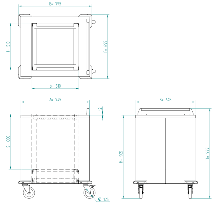 645 x 745 x 910 mm (695 x 795 x 910 mm einschl. Stoßecken)