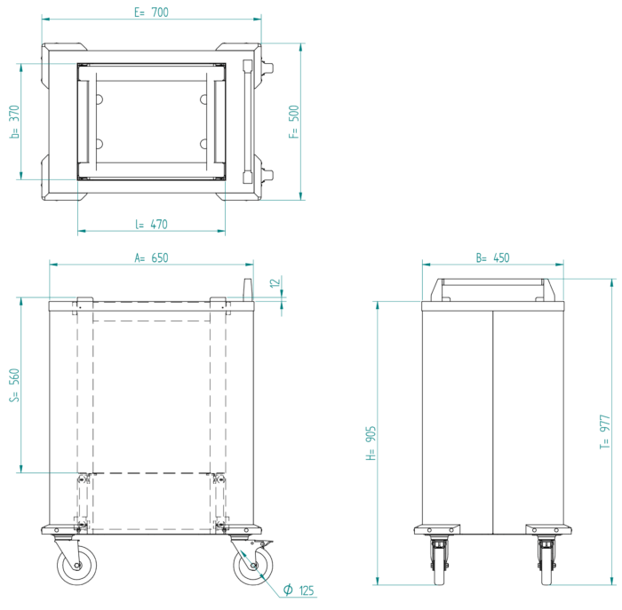 - Fahrbar, mit 4 Kunststoff-Lenkrollen 125 mm, 2 davon feststellbar und ergonomischem Schiebegriff, Rollenführung aus Hitzebeständigem Material