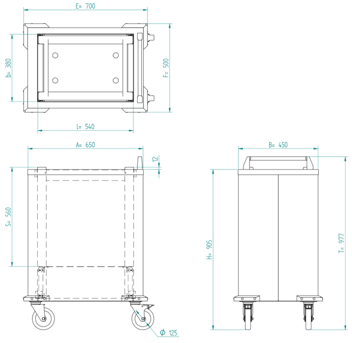 - Fahrbar, mit 4 Kunststoff-Lenkrollen 125 mm, 2 davon feststellbar und ergonomischem Schiebegriff, Rollenführung aus Hitzebeständigem Material