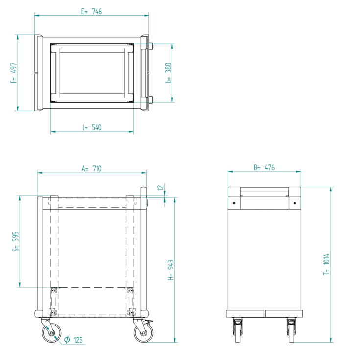 - Fahrbar, mit 4 Kunststoff-Lenkrollen 125 mm, 2 davon feststellbar und ergonomischem Schiebegriff, Rollenführung aus Hitzebeständigem Material