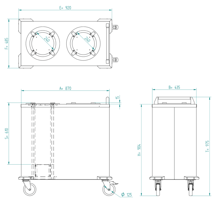 - Fahrbar, mit 4 Kunststoff-Lenkrollen 125 mm, 2 davon feststellbar, Rollenführung aus Hitzebeständigem Material