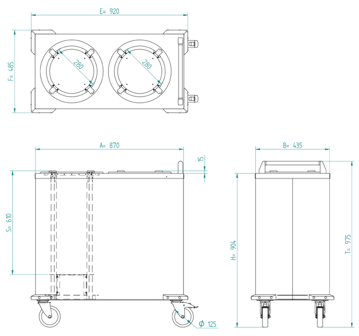 - 2 unabhängige Stapelröhren (Stapelhöhe 660 mm einschl. Deckel) mit Multi-Federsystem, Einstellen der Ausgabehöhe durch Ein- und Aushängen der hitzebeständigen Zugfedern. Die Tellerstapler sind mit einem Flansch ausgestattet und können einfach aus dem Wagen heraus genommen werden. Einfache Reinigung und Servicefreundlich