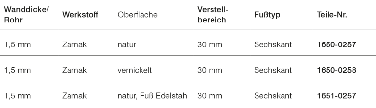 Werkstoff: Belastbarkeit: Höhe (H1): Verstellbereich: Wanddicke/Rohr: Fußtyp: