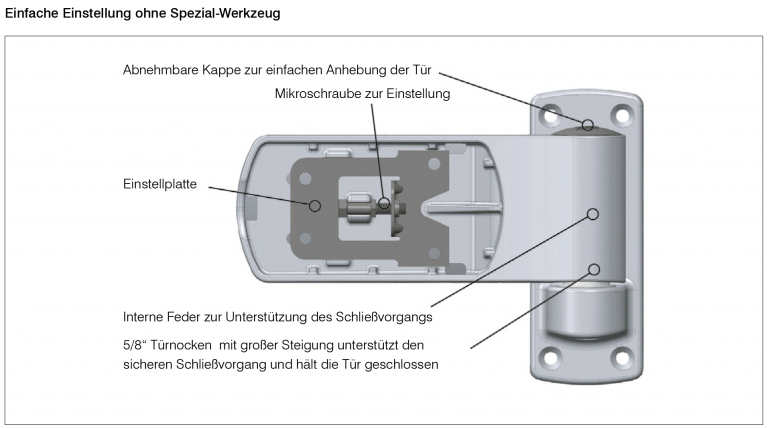 – Horizontale Einstellung des Scharnierbands verhindert dauerhaft eine Absenkung der Tür