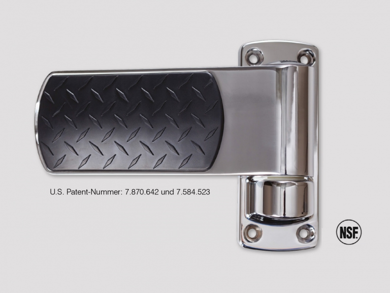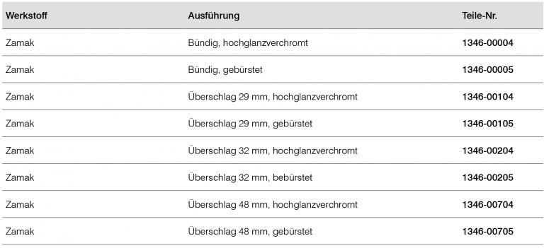– Werkstoff: Zinkdruckguß verchromt, poliert oder gebürstet. Nylonnocken, schwarze Elastomer-Abdeckung, wahlweise auch in Edelstahl oder in Wunschfarbe.