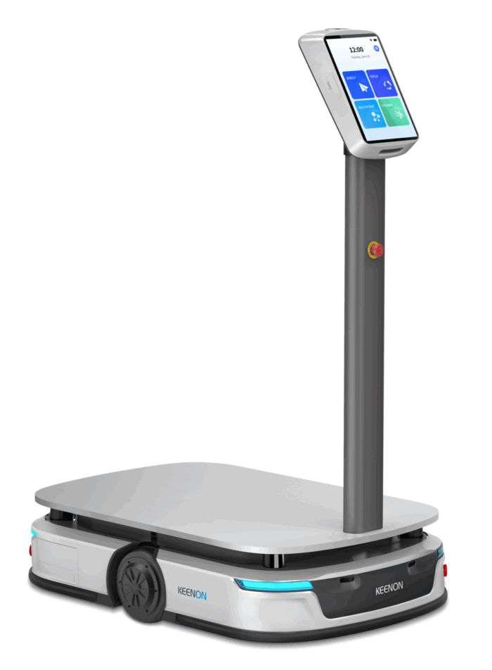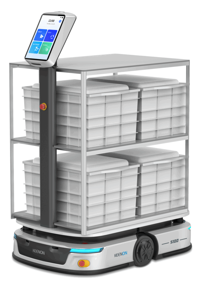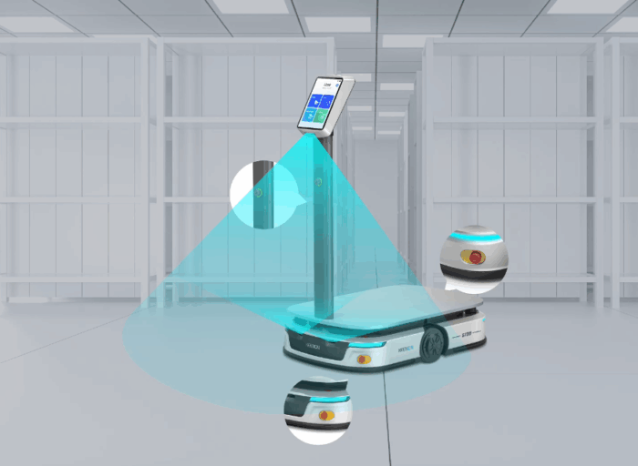 der Vorderseite, seitlich und rückseitig gewährleistet. Weitere Features ist das Bildpositionierungsmodul mit Touch-Display Panel, 2 Antriebsmotoren, eine Batterie für bis zu 8 Stunden Betriebszeit, eine Akkuladezeit von 2,5 Stunden, 3 Stereo-Vision Sensoren, 2 LiDAR Sensoren, 360° Anti-Kollision-Streifen, minimale Durchgangsbreite ohne Rotation 90cm, maximale Durchgangsbreite mit Rotation 120cm, Geschwindigkeit maximal 1 Meter in der Sekunde und ein anpassbares Regalsystem, im Standard für 4 Materialboxen mit den Maßen (BxTxH) 600x400x350mm.